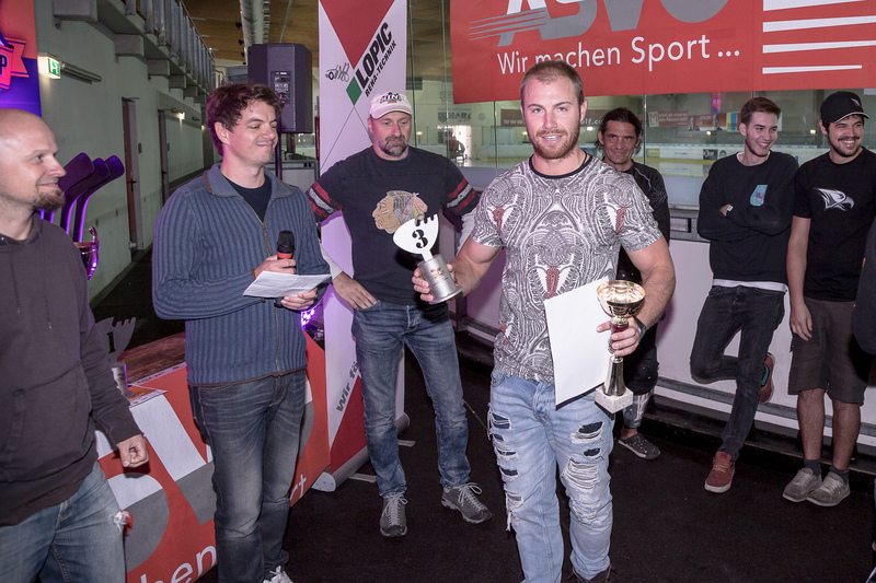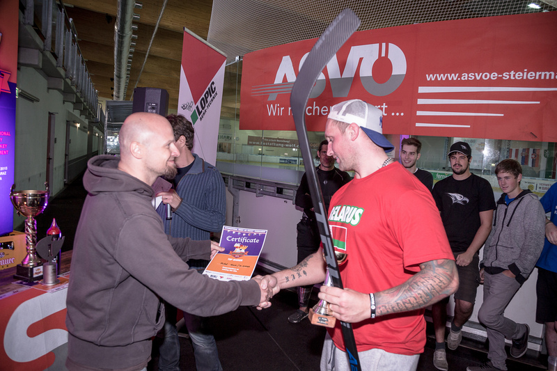 Erst am letzten Tuniertag wurde entschieden eine neue Auszeichnungskategorie einzuführen, weil etliche Spieler nicht unbedingt nach frischen Blümchenduft riechend in der Eishalle eintrafen. Es gab einige Anwärter, aber den Sieg teilten sich dann dennoch mit großen Abstand Christopher Merdonik und Michael Mair und jeder bekam als Preis eine Tube Duschgel. Gratulation.